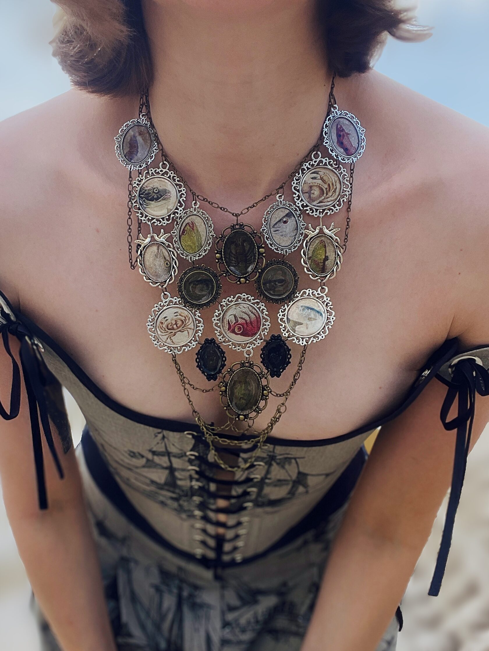 Ключевые материалы - старые рамки, металлические украшения, тканевые фрагменты и фурнитура, найденная в секонд-хенде. Все они обрабатываются вручную, соединяются в неожиданные композиции и оживают в колье и аксессуарах. Главное - не просто переработка, а пробуждение характера в материи.